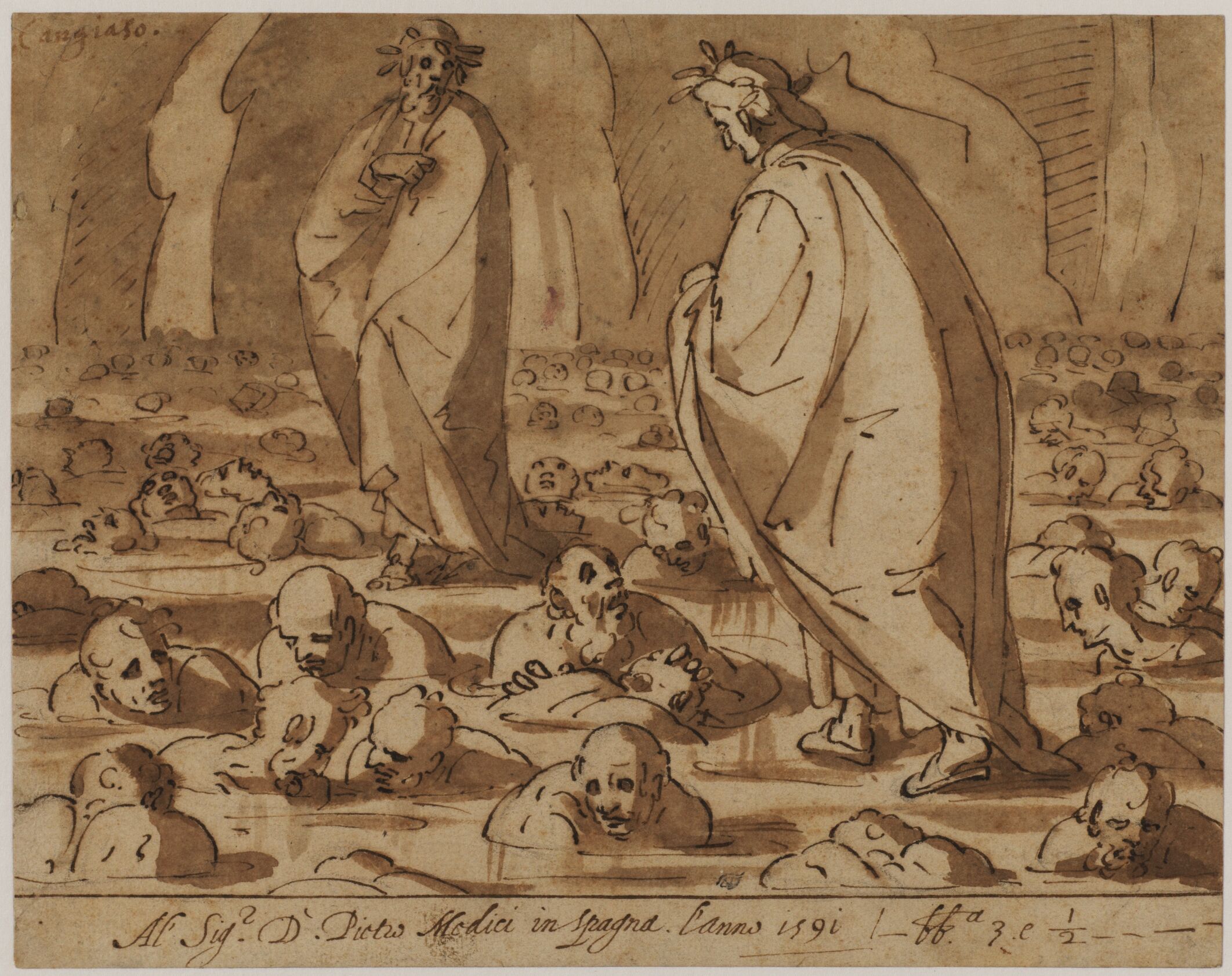 In this ink-and-wash drawing, which was recently given to the J. Paul Getty Museum, two figures stand in a harrowing setting, surrounded by the heads of numerous submerged bodies. Giovanni Battista Paggi (1554–1627) represents a famous episode from Dante’s fourteenth-century poem The Divine Comedy, narrated at the end of Canto XXXII and at the beginning of Canto XXXIII of the Inferno. Dante, on the right, encounters a group of traitors in hell, who are trapped in the frozen lake of Cocytus as punishment. While walking with Virgil, he stops to question a few desperate souls, including Count Ugolino della Gherardesca, who is gnawing on the head of Archbishop Ruggieri degli Ubaldini. Ugolino, a former governor of Pisa who betrayed his citizens, recounts to Dante his tragic personal story in which he was imprisoned with his sons in a tower where they starved to death. This treacherous punishment was inflicted on Ugolino by Ruggieri, who then nominated himself governor of the city.