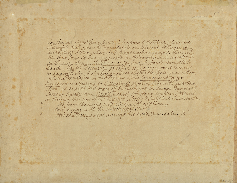 See the end of the Thirty Second, and beginning of the Thirty Third Canto / of Dante’s Hell, where he describes the punishment of Ruggieri / archbishop of Pisa, whose skull Count Ugolino gnaws, whom with / his four sons He had imprisoned in the Tower, which was after / called from thence, the Tower of Famine, and starved them all to / Death; Dante’s Description of which is one of the most famous / we have in Poetry, and of which my Dear Late Father hath given a Beau/tifull a Translation in his Treatise of the Connoisseur. p. 36. / Dante is here attending to C. Ugolino’s shocking tale, with great emo/tion, as he hath just taken off his Teeth from the savage Banquet and / looks up towards Him. Virgil, Dante’s constant attendant and direct/or through this part of his journey, stopps and looks back with Compagnon / ‘He from the horrid food his mouth withdrew, / and wiping with the clotted offal hair / his shuddering Lips, raising his head, thus spake.’