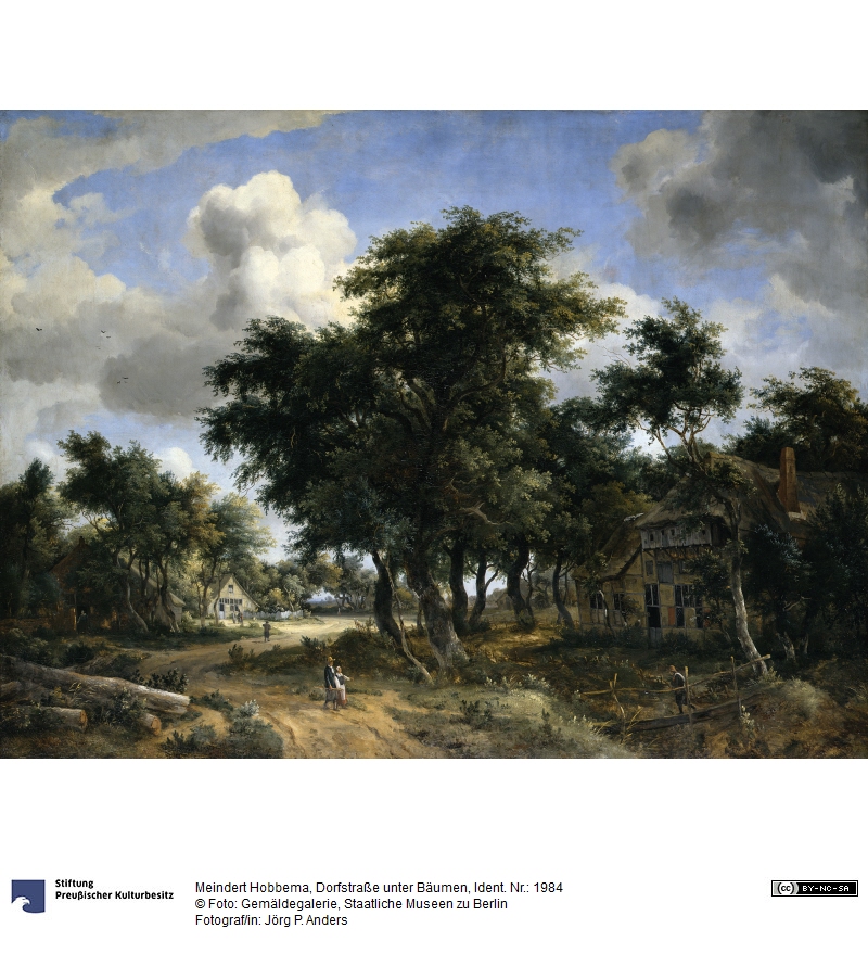 Measuring approximately 98 x 130 cm, the group includes: Village Street under Trees, ca. 1665 (Berlin, Gemäldegalerie, inv. 1984); Wooded Landscape with a Pool and Watermills, ca. 1663–68 (Cincinnati, The Taft Museum, 1931.407); Wooded Landscape with Cottages, ca. 1665 (The Hague, Royal Picture Gallery Mauritshuis, inv. 1105); Village among Trees, 1665 (New York, Frick Collection, 1902.1.73); A Wooded Landscape, 1663, and A View on a High Road, 1665 (Washington, DC, National Gallery of Art, 1937.1.61, 1937.1.62); Cottages in a Woodland Clearing with a Young Fiddler Arriving Home in a Cart Greeted by his Family, ca. 1665 (Baron von Dedem). ↩︎
