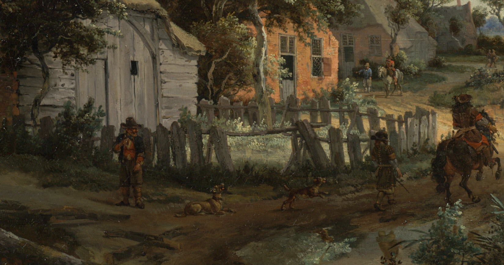 Nothing is known of Hobbema’s studio practice. However, the confident and energetic brushwork in this painting suggests that he composed his subjects directly on the canvas according to a well-established process.7 A few small pentimenti are visible to the naked eye, revealing Hobbema’s fine-tuning of the rhythm of the elements in the scene. Notably, Hobbema painted over a few of the slats in the fence around the barn (at left; fig. 4) to create a gap that suggests dilapidation as well as an area of greater visual interest. Storck also made alterations to the figures while he was painting; for example, the hat of the man at left was made smaller.