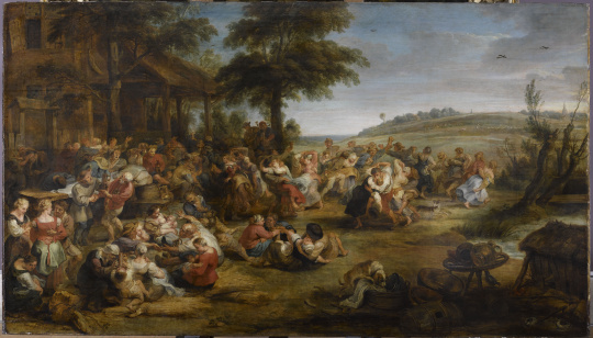 In preparing La Surprise, Watteau turned to his collection of drawings, specifically a vigorous red and black chalk drawing for the figure of Mezzetin today in the Louvre (fig. 2),8 and a wonderful red chalk drawing for the pair of lovers in the Musée des Arts Décoratifs, Paris (fig. 3).9 The Louvre drawing of Mezzetin is undoubtedly a life study of a posed model, dressed in a costume that probably belonged to Watteau himself. The artist used this study some years earlier in his paintings, such as the small Donneur de Sérénades (The Serenader) in the Musée Condé, Chantilly, and later for the figure of the guitarist in the Réunion en plen air (Conversation in the Open Air) in the Gemäldegalerie, Dresden. The careful depiction of the guitar undoubtedly reflects his direct knowledge of a model developed by the Voboam family of luthiers, active in Paris between 1650 and 1730.10 The drawing for the pair of lovers, on the other hand, replicates a detail of a large painting by Peter Paul Rubens (1577–1640), La Kermesse (The Village Wedding) (fig. 4). Watteau must have carefully studied this work, which had entered the collections of Louis XIV in 1685. What surely attracted him to Rubens’s young country couple was the swirling centrifugal movement and sensual energy.11 First in the drawing, then in the painting, however, Watteau transfigured his model into something instantly recognizable as his own. As Svetlana Alpers has pointed out, “the physical exertion of the dance, emphasized by Rubens through the sheer weight of the woman whom the young man so energetically supports, is transformed—despite the rough kiss—into a pattern. The bodily contact is replaced by a suggestion of fragile social interplay [.…] Embracing on a grassy bank, the couple is now fit company for the music of the courtly guitar rather than the rustic bagpipe, and a dog rather than a pig is the appropriate attendant animal.”12 We know that during his training with Claude III Audran, Watteau had direct access to the grandiose cycle that Rubens had been commissioned to paint for the Palais du Luxembourg by Marie de’ Medici almost a century earlier: thus, for example, the dog in the foreground of La Surprise is a reversed quotation of the dog that appears in Rubens’s The Marriage by Proxy of Marie de’ Medici to King Henry IV (Paris, Louvre). What drew Watteau to Rubens, however, was not the cultivated painter of complex allegorical compositions but above all the great colorist whose talent had been praised by the French art critic Roger de Piles (1635–1709) in his writings. Watteau was mainly attracted by Rubens’s brilliant brushwork and sumptuous palette, by his vivid portrayal of characters, and by his talent in rendering textures, from the rustle of silk to the consistency of velvet.