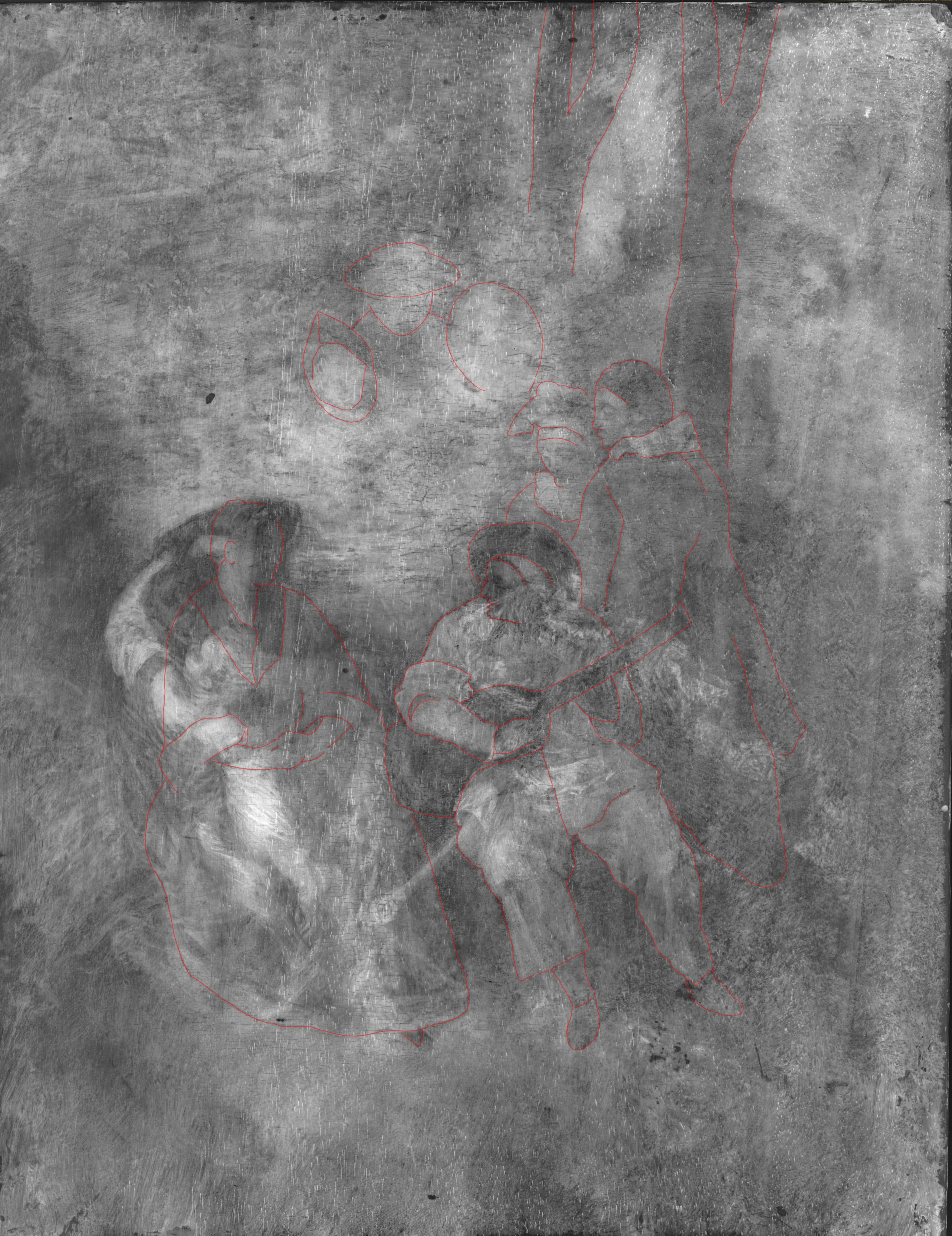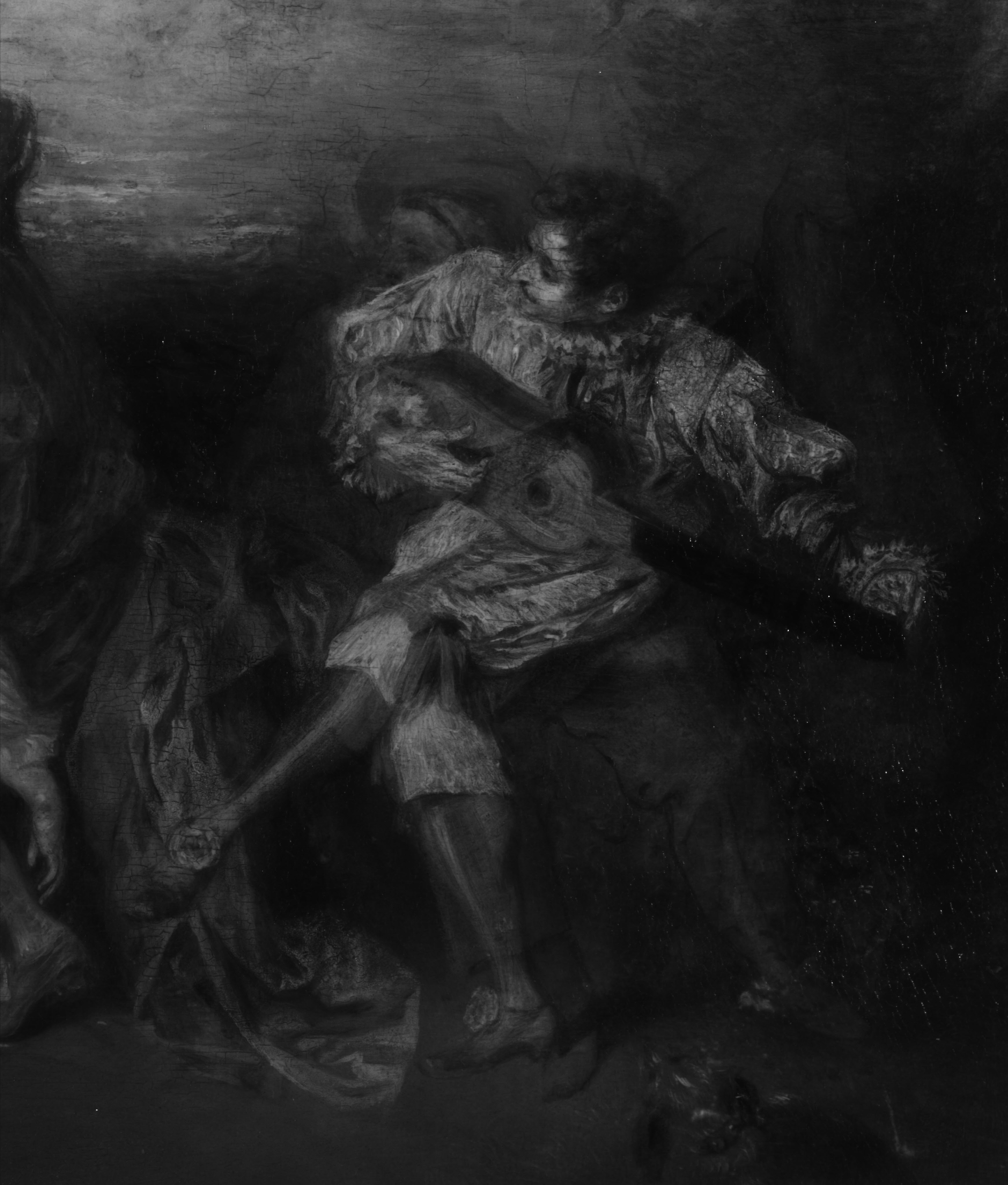 observing the X-radiograph (fig. 5) and the infrared reflectogram of the work (fig. 6), we find that Watteau had originally drafted a