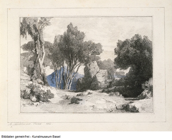 Born in Basel in 1827, Böcklin received his formative training at the Düsseldorfer Kunstakademie, where he studied landscape under Johann Wilhelm Schirmer (1807–1863). The scores of plein-air pencil drawings that survive from this period indicate an early and determined practice of direct nature observation (see fig. 1).2 Although for symbolic landscapes like Spring in a Narrow Gorge he abandoned his earlier methods in favor of a more inventive approach, the eerily convincing materiality of even these imaginary scenes plainly derives from a prolonged study of nature.3 A brief visit to Paris in 1848 brought the young Böcklin into contact with the work of Jean-Baptiste-Camille Corot and the Barbizon painters, whose influence on his own practice, despite his later claims to the contrary,4 can be observed in a number of the artist’s landscapes, including the present picture with its pearly sky, dark trees, thinly painted cliff faces, and tiny flowers picked out with bright flecks of color.