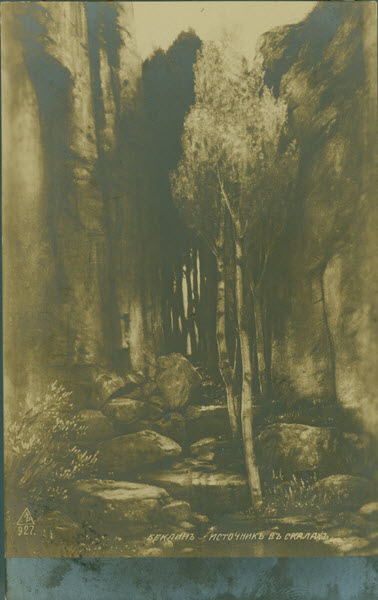 The path of Spring in a Narrow Gorge through the late nineteenth and twentieth centuries reflects the trajectory of Böcklin’s reputation. The picture seems to have been rather famous in the fin de siècle*.* Newspapers noted the stir generated by the “sonderbaren Komposition” (curious composition) on its initial exhibition in Berlin,14 and the painting forms the subject of a poem published as part of a collection of Böcklin-Gesänge (Böcklin odes) in 1898. The poet Felix Lorenz conjured the scene with evident enthusiasm, from “the roots of the trembling trees” that “dip cool, into the stones and ripples” to the “night-dark poplars” of the background, which he compared to the “dreams of heroes.” 15 The great art historian Heinrich Wölfflin included a slide of the picture in his lecture course on German art at the University of Vienna.16 The painting’s reputation, moreover, reached beyond the German-speaking world. Photographic postcards bearing its image were dispatched from Russia and Poland in the 1910s (figs. 3a and 3b).17