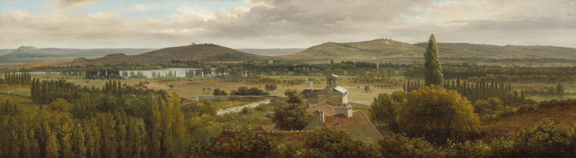 Bidauld was trained in Lyon, attending courses at the Académie there alongside his almost identically named brother, Jean-Pierre-Xavier Bidauld (1745–1813). Jean-Joseph moved to Paris in 1783 with a letter of introduction to the leading landscape painter of the day, Claude-Joseph Vernet (1714–1789).2 He spent two years absorbing the classical landscape tradition of Claude Lorrain (1604–1682) and Nicolas Poussin (1594–1665) through his teacher Vernet, and making copies of Dutch paintings for a picture dealer named M. Dulac. In 1785, Dulac helped pay for Bidauld’s trip to Rome. He spent five years in Italy, traveling the Roman states, Tuscany, and the Kingdom of Naples. He painted the hill towns of Subiaco, Narni, Civita Castellana, Isola di Sora, and the mountains of the Abruzzi, establishing an informal tour that would be followed by landscape painters for generations, including, most famously, Jean-Baptiste-Camille Corot. On his return to France in 1790, Bidauld submitted classical landscapes, or paysages historiques, to the Salon, where they were accepted in 1791 and regularly thereafter for the duration of his career. He was the first landscape painter to be elected to the Institut de France, in 1823, and to be awarded the Legion d’honneur, in 1825.