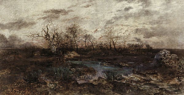 Although he was born in Paris and kept a fairly firm foothold in the French capital through most of his career, Rousseau devoted himself to recording the French countryside, and in particular the forest of Fontainebleau. From 1836 on, he regularly summered in Fontainebleau, returning to Paris each winter, until 1847, when he bought a house in Barbizon and settled there permanently. In paintings such as this one, he was inspired by such naturalist painters as John Constable (1776–1837), whose paintings could be seen throughout Paris in the 1820s and 30s, and by seventeenth-century Dutch landscape painters such as Jan van Goyen (1596–1656), Jacob van Ruisdael (1628 or 1629–1682), and Meindert Hobbema (1638–1709). Both models induced Rousseau to focus on everyday, unstructured aspects of observed nature. His canvases convey a sense of the urbanite’s nostalgia for the slower pace and traditional ways of rural life and the constant rhythms of weather and seasons.2 He was particularly taken with what he perceived to be the solidity and stoicism of old trees, and he produced hundreds of tree sketches in oil, pencil, and crayon.