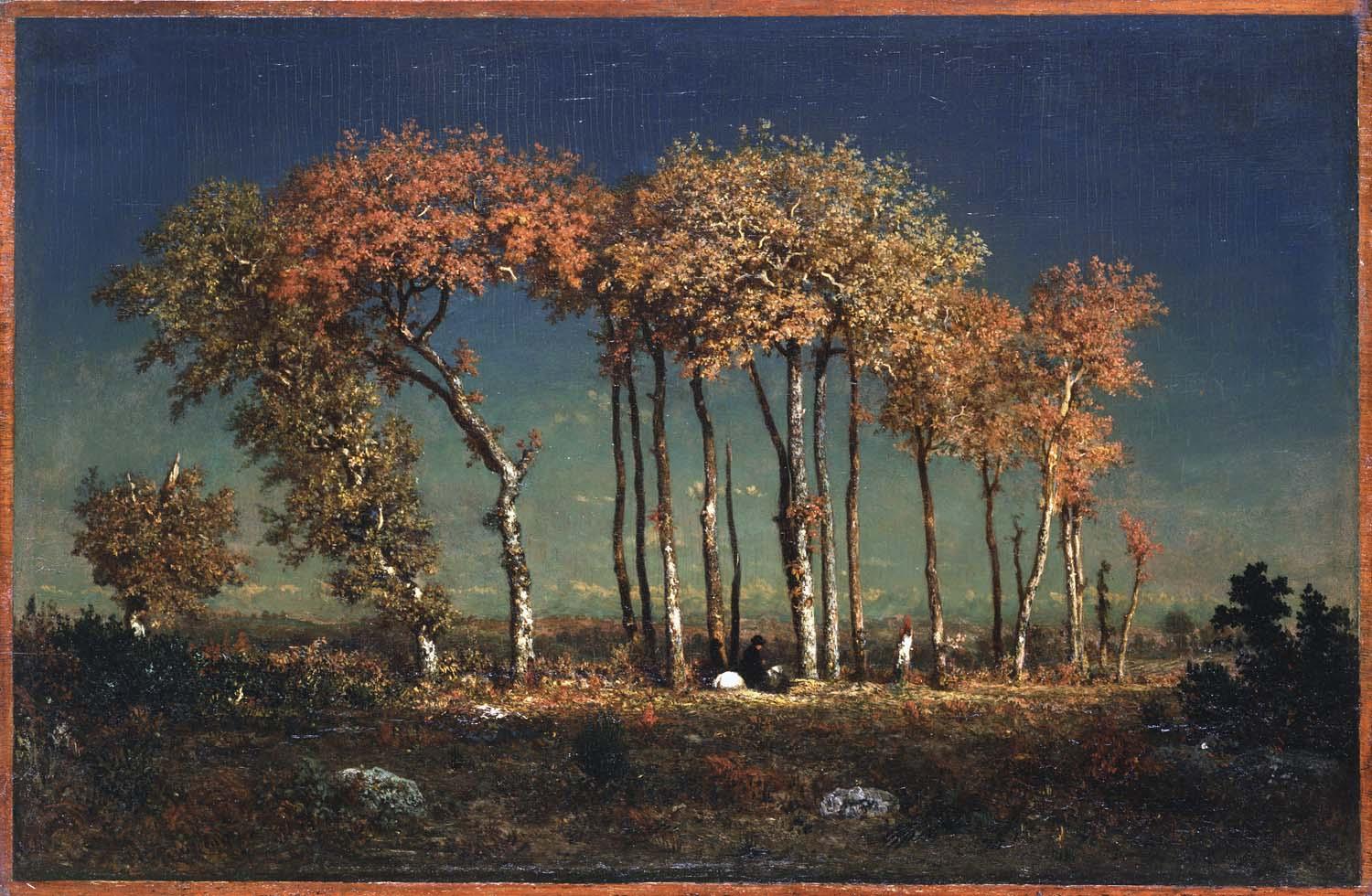The Getty painting relates to a category referred to by some scholars in the literature as dessin-peinture, in which the artist notates the composition on-site in chalk and thin layers of paint, and then returns to the studio to enhance particular elements and pull the composition together. It was a practice developed with Jules Dupré in 1844 when the two painters traveled to Landes and worked at recording their direct impressions on location.6 This kind of painting, large in scale and sketchlike in facture, includes the Mesdag Museum’s Chopping Trees on the Ile de Croissy (1847) and Vieux chêne à Fontainebleau (1852), the Metropolitan Museum’s Soleil couchant sur la lande d’Arbonne (ca. 1863), the Cleveland Museum of Art’s Edge of the Forest at Sunset at Bas-Bréau (ca. 1860), the Museum of Fine Arts, Houston’s Great Oaks of Old Bas-Bréau (1864; fig. 1) as well as two works recently on the market, Soleil couchant sur les sables de Jean-du-Paris (ca. 1864) acquired by the Wadsworth Atheneum, and La mare aux fees, forêt de Fontainebleau (ca. 1848, private collection; fig. 2). These paintings are the seeming antithesis of the smaller, more iconic paintings by Rousseau that are defined by their meticulous, careful, highly labored facture, such as Toledo’s Under the Birches, Evening (Le curé) (1842–43; fig. 3.) and the Frick Collection’s Village of Becquigny (1857–65). And they are not always easy to date, in part because Rousseau tended to paint in a variety of levels of finish simultaneously and across his career.