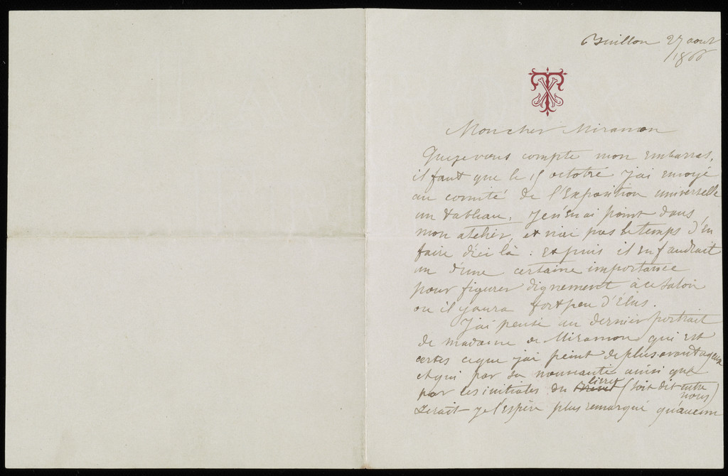 I thought of the recent portrait of Madame de Miramon which is certainly one of the most advantageous [avantageux] I have ever painted, and which for its novelty as much as well as for the letters in the booklet (as they say, between us) [par les initiales du livret (soit dit entre nous)] would be, I hope, among the most remarked upon paintings. It is true that it will attract perhaps too much attention for its originality, but, in sum, it’s better like that, and if you would like to brave the publicity, I would be delighted, and indebted to you for the advantages which the exhibition will bring me.