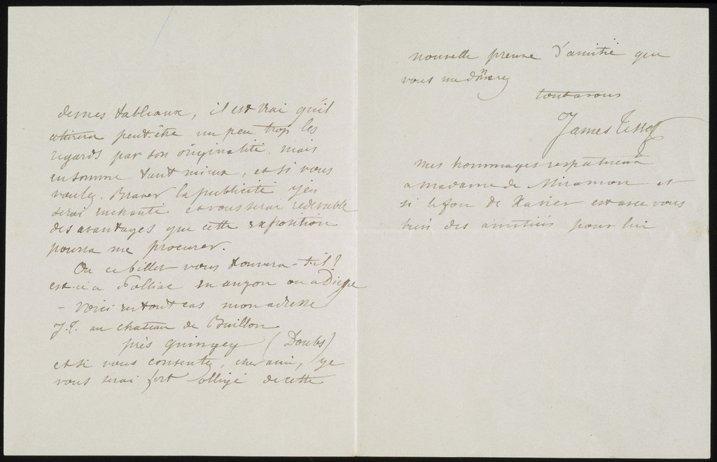 The letter is of interest both in the way Tissot characterizes the Getty painting and in the familiar tone he takes with this prominent member of Second Empire high society: