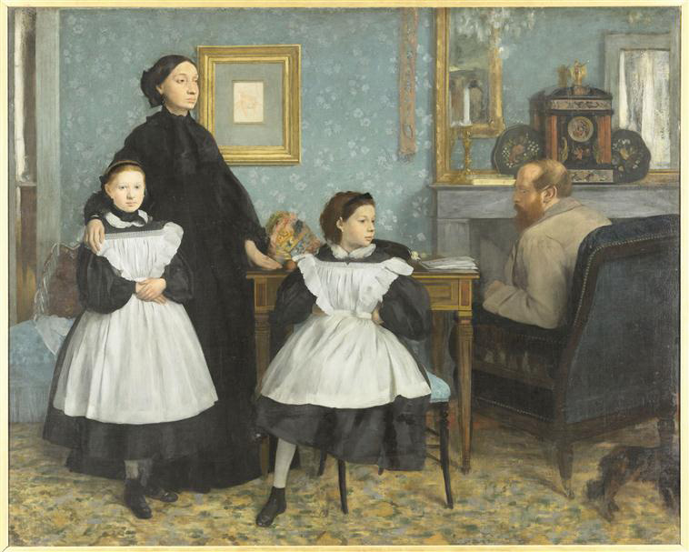 Arguably Tissot’s most significant artistic friendship during the years in which he painted the Getty canvas was with Degas. The two painters worked together in developing scenes of contemporary people in personal settings as subject matter for modern art and, especially, in exploring in their paintings the social and psychological state of Victorian women and to a lesser degree men.11 Both painters probed “the dark side” of female experience, with images of women in various states of melancholy, depression, and illness (fig. 5).12 Like Tissot, Degas had trained under Lamothe in the 1850s, and in paintings both informal and ambitious, the two painters can be seen to have actively responded to each other’s work throughout the 1860s. The Getty portrait may have served as a prototype for Degas’s pastel portrait of his sister Thérèse, Mme. Edmondo Morbilli (ca. 1869, private collection.)13 And the Musée d’Orsay Portrait of the Marquis and Marquise de Miramon and Their Children is clearly indebted to Degas’s Bellelli Family (1858–60; fig. 6) in the pose of the boy Léon with his leg tucked under his arm, the shallow friezelike organization of the figures, and their psychological isolation from one another. Degas’s ambitiously scaled portrait of Tissot (1868, Metropolitan Museum of Art, New York) shows a young handsome dandy, fresh off the Parisian boulevards, sitting in a painting studio (possibly his own), surrounded by copies of Japanese art, Baroque and German Renaissance painting, and contemporary genre (fig. 7. The composition is similar to Tissot’s Portait of Mlle L. L., exhibited at the Salon of 1864.14 The casual aloofness of the sitter is characteristic of Degas’s self-portraits of the period, and it has been suggested that this portrait of the painter in his studio represents Degas’s self-conception as an artist at the time.15 The portrait is sympathetic and familiar, and whether the painted copies hanging in the background belonged to Degas or to Tissot, they indicate shared artistic interests between two artists during a formative moment in their careers.
