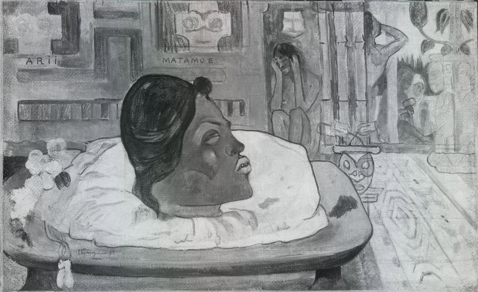 Scholars have consequently argued that the painting alludes to the death of Tahiti’s last king, Pomare V, which happened just after Gauguin’s arrival on the island in 1891.11 As described in Noa Noa, the king’s death for the artist becomes emblematic of the death of traditional Tahitian culture as a whole in the face of European civilization and colonization: