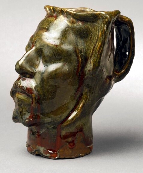 Besides the decapitations featuring routinely in old master painting, Gauguin’s severed head would have automatically conjured for French audiences the guillotine, the execution, or “royal end,” of Louis XVI (particularly in 1893, the centenary of that event), and the Revolution’s legacy of capital punishment, which for many critics had lodged a new barbarism in the heart of French society.20 Significantly, Gauguin’s own artistic interest in decapitation was first triggered by his witnessing of the guillotining of a convicted murderer in December 1888.21 It was only after that occasion that the motif appears in his art, first in a ceramic jug he fashioned as a self-portrait, with blood-red glazing for gory detailing (fig. 4), and then in a still-life painting that wittily juxtaposes the same jug with a Japanese print of a grimacing warrior brandishing a sword.22 Gauguin’s morbid interest in severed heads was further overdetermined by his place in the French Symbolist milieu of the 1870s–90s, in which a psychosexually fraught imagery of the decapitated Orpheus, John the Baptist, and other legendary figures became pervasive.23