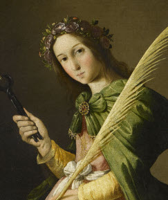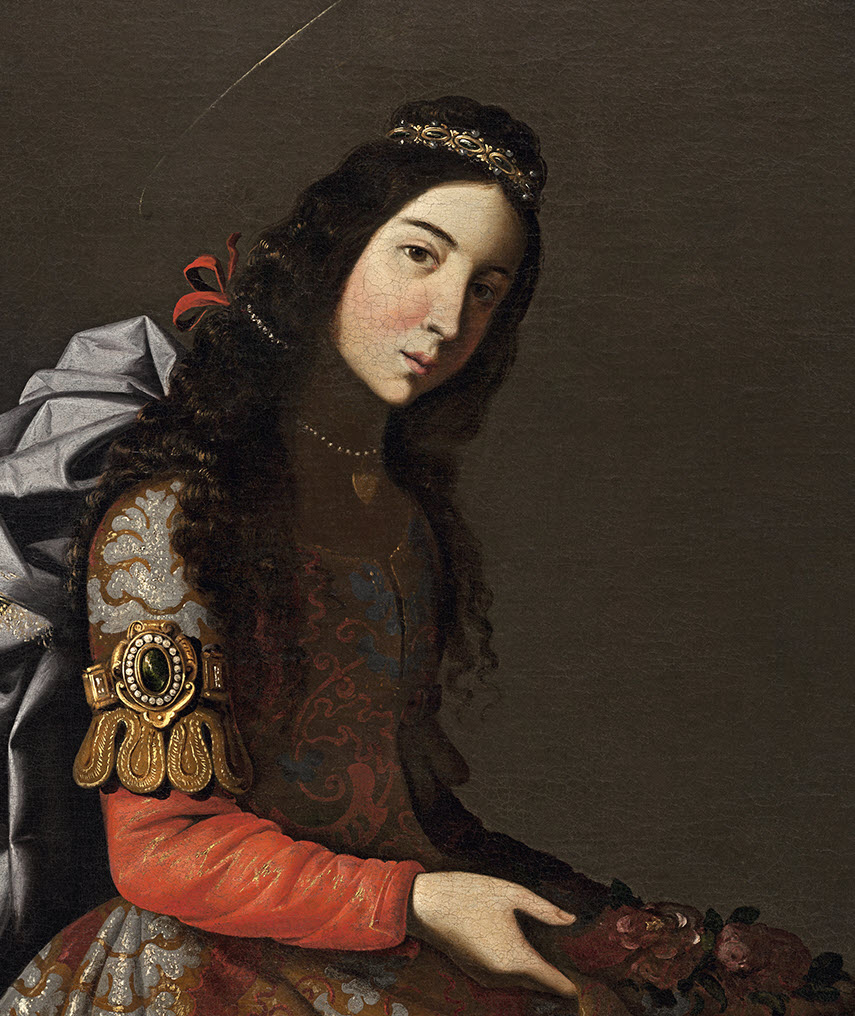 Scholars have been right to detect a certain Spanish flavor in Millet’s early Cherbourg work, for his time in Paris had coincided with the opening, in January 1838, of King Louis-Philippe’s Galerie espagnole in the Louvre, a major event in the artistic life of Paris and in Millet’s own education. He wasted little time in visiting this large collection of Spanish painting and writing enthusiastically about it to friends in Cherbourg.33 Works by and attributed to Francisco de Zurbarán dominated the display, and his full-length female figures in particular commanded attention.34 Zurbarán’s female saints also figured prominently in top-tier Parisian collections like that of Marshal Soult (1769–1851), and one might recognize a distant template for the bodily attitude, the tilt of the head, and the forthright gaze of Millet’s Mme Feuardent in paintings like Zurbarán’s Saint Casilda or Saint Apollonia (figs. 4-5), both of which were then in Soult’s collection.35 Contemporary critics highlighted the mixture of saintliness and allure in Zurbarán’s female figures,36 and Millet may very well have sought to nuance his portrait of his friend’s wife in a similar way.