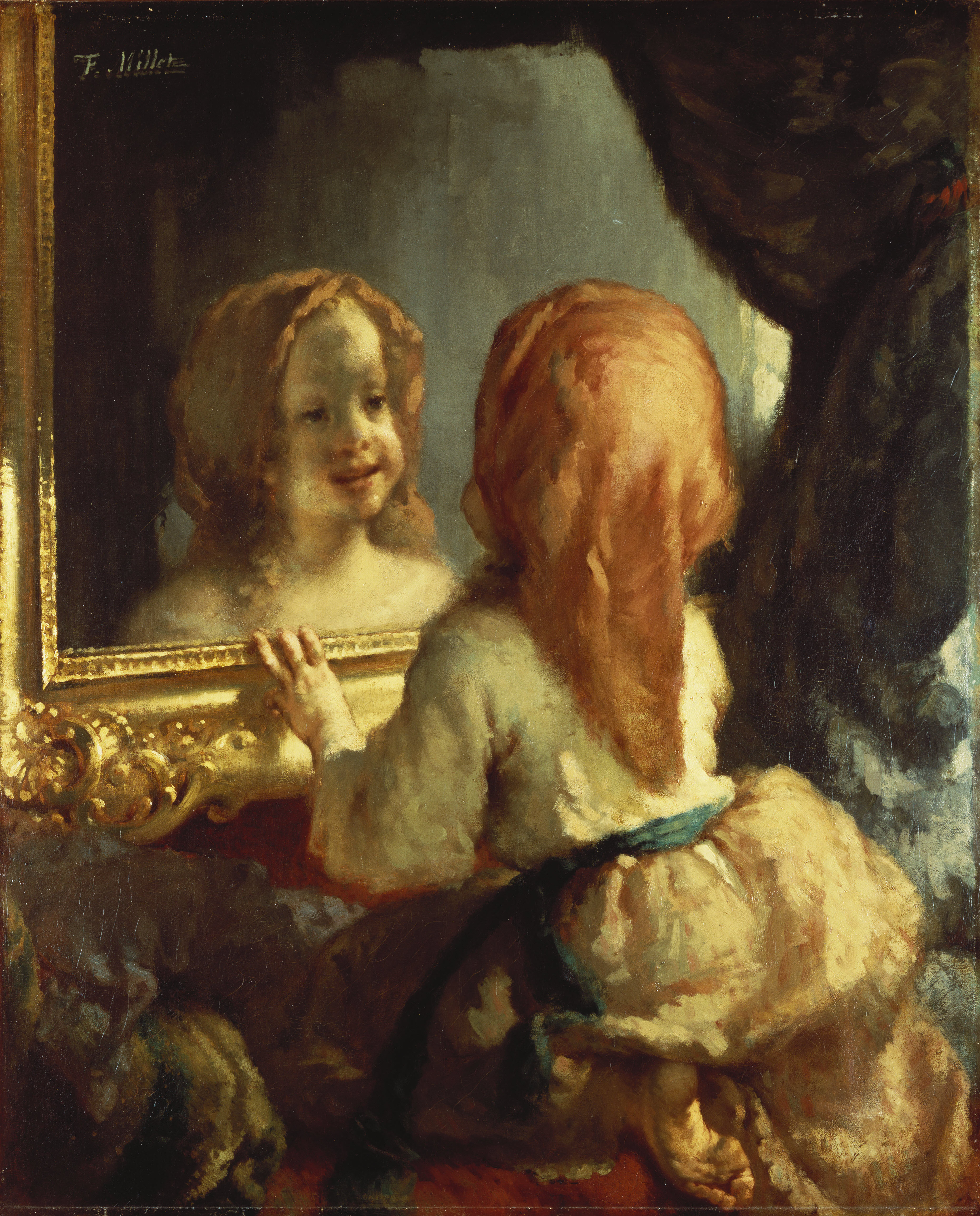 Even after their career paths led them in different directions, Millet, Feuardent, and their spouses were important fixtures in each others’ lives. Feuardent continued exhibiting Millet’s work in his shop,53 even after the Javain affair had reportedly soured Millet’s relationship with the Cherbourg city councillors and other local notables in 1841.54 In November 1842 during a return visit from Paris, Millet acted as witness to the birth of the Feuardents’ second child, Louise-Pauline,55 and on subsequent trips he would again portray members of the Feuardent family. When Millet returned to Cherbourg in 1844 following the untimely death of Pauline Ono, he enlisted Antoinette Hebert, the one surviving child from Mme Feuardent’s first marriage, to pose for the little girl kneeling before a mirror in one of the most memorable works executed in his so-called “manière fleurie,” or florid manner, which was characterized by rich coloration and roughly textured brushwork―a far cry from the austerity of his earlier portraits (fig. 6).56