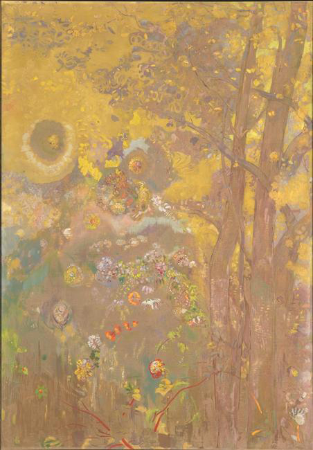The weight Redon placed on the decorative surroundings in the portrait may also be understood more generally as an assertion of the artist’s own rich inner life. Flowers and flowerlike forms recur throughout his work, and in his writings flowers frequently supply metaphors for the creative blossoming of the artist’s imagination, for the lyrical expansiveness of his work. Existing in an indeterminate space between representation and abstraction, nature and fantasy, Redon’s “dream flowers” were in turn meant, in true Symbolist fashion, to induce states of indeterminate, free-floating reverie in his viewers. Indeed, whatever hint they may offer of the baroness’s interior world, Redon assured by her vague expression and three-quarter profile presentation that there be no direct, intimate connection between the sitter and the viewer, who is consequently left to project what he or she will onto the portrait and its pulsating floral dreamscape. “An art that suggests,” Redon noted, “is like an irradiation of things for the dream.”20