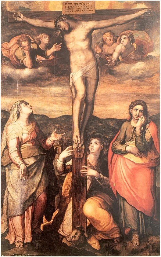 Marco Pino paints a solemn and dramatic scene. Against a gloomy sky, the lifeless body of Christ hangs from a slender wood cross, his head slumped and surmounted by a feeble ray of light, his hands and feet pierced by iron nails. The elegant and monumental figure of the Virgin (left) looks up at the Christ while Saint John (right) gazes directly at the viewer. From the bottom right, Saint Catherine of Siena witnesses the scene. Catherine is dressed in the robes of the Dominican Order, hands folded in prayer holding a lily and a small cross, and eyes cast towards the Crucifixion group. The chromatic contrasts of Pino’s vivid palette enhance the dramatic moment of Christ’s expiry and encapsulate the expressive quality and emotional charge of the painting.