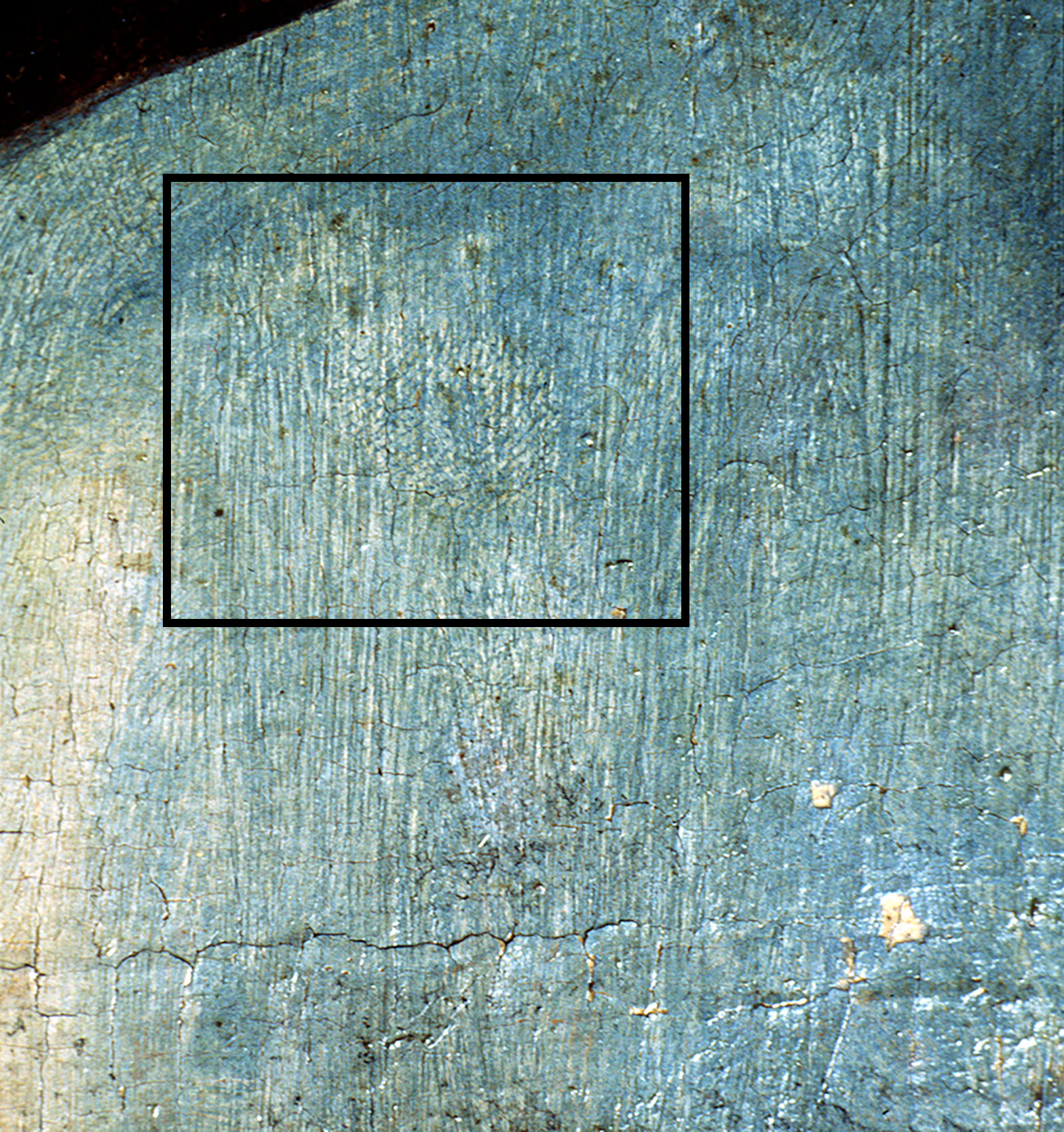 The contemplative and expressive character that distinguishes Pino’s painting and unites it with Vasari and Michelangelo’s Crucifixions was meant to address specific needs dictated by the religious climate in which the artist operated. The decades around the mid- and late sixteenth century were defined by the Counter-Reformation, the process of self-review and renewal of the Catholic Church in response to the denunciations made by the Protestant Reformation. Such moral and religious change gradually impacted the visual arts, and most notably, its devotional function. New devotional images, like those painted by Pino, were intended to provoke an interior response in the viewer, encouraging contemplation and inspiring piety and worshipful sentiments.12 Scenes depicting the Passion of Christ, including the Crucifixion, were particularly suited to this contemplative function. Pino’s work complied with these requirements, while also maintaining a high degree of inventiveness and expressive freedom: the artist proved able to produce images that were both easily readable and powerfully engaging. The Getty panel is a fine example of Pino’s ability to achieve such an iconic yet expressive effect, which he obtained by balancing a simple and structured composition with a contrastingly emotive color palette and moving details, like the theatrical features of the Christ’s body or the restless sky.13 To create this vivid atmospheric background, Pino first applied a bright orange-red underlayer (imprimatura), followed by a pink layer, which was intended to be visible in the background and bestows a sense of transcendence to the scene. Pino further rendered the texture of the sky by energetically applying the paint, which he later modelled using his fingers.14 Five centuries later, the Getty painting still, quite uniquely, preserves the fingerprint of the artist (fig. 4).