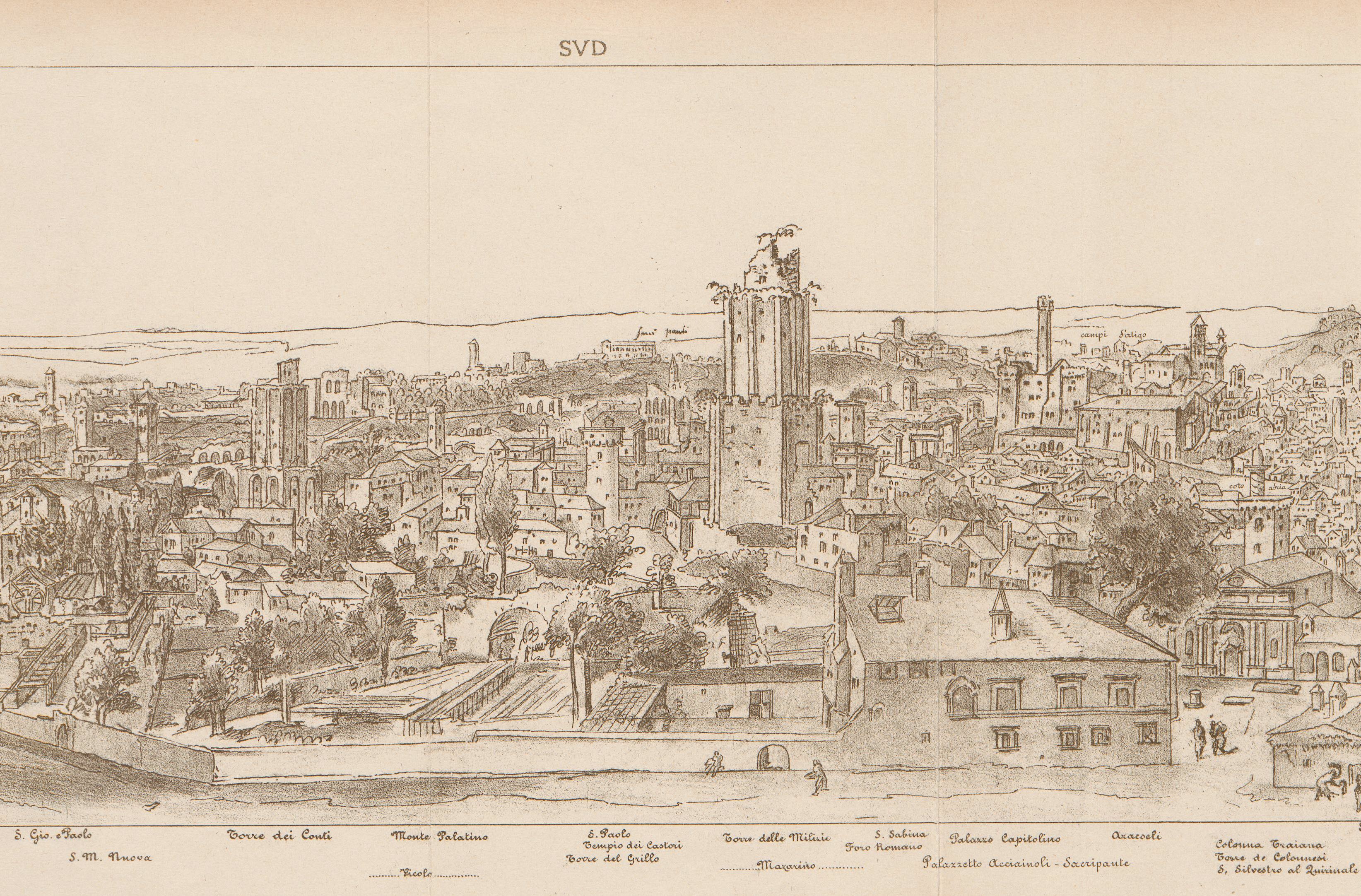 While nothing is known of the original location of the panel, its devotional subject and large size indicate that it initially functioned as an altarpiece, which was possibly intended for a chapel or a monastic interior.17 In the 1570s, the years in which Pino produced Christ on the Cross, many female monasteries were being reformed in Rome in the surge of the Tridentine legislation. Among the regulations promulgated by the Council of Trent, the decree De regularibus et monialibus (Session xxv, chapter 5, 3–4 December 1563) re-enforced the seclusion of female religious communities and led to the development in the following years, in Rome as in other cities, of new cloistered establishments.18 In particular, in the Rione of Monti in Rome, the Dominican nuns founded several new monasteries between the 1560s and 1570s, including those of the Santissima Annunziata delle neofite and Santa Caterina da Siena a Magnanapoli.19 Dominican communities, such as those of the Annunziata and Santa Caterina were supported by and comprised of noblewomen, daughters, and widows from the highest-ranking classes of society. Although segregated from the secular world, some of these women were active art patrons and, through the intermediation of families and external agents, were able to commission significant artworks.20 As the focus on Catherine’s figure (a Dominican Saint), seems to suggest, Pino’s Christ on the Cross could have been painted for one of these cloistered Dominican communities, where it would have remained unseen by writers and biographers for decades. The size of the altarpiece, less monumental than those painted by Pino in those same years for high altars or prominent private chapels, would be consistent with this more secluded location. Further connections to this monastic, and notably Roman Dominican, context may be suggested by the painting itself: the background landscape of the Getty panel includes specific allusions to Roman scenery, such as the Tiber river, Trajan’s Market (at the right of Christ’s feet) and, notably, the Milizie and Conti towers (at the left) (fig. 6). The old medieval towers stood in the Rione of Monti where the Dominicans established their new monasteries and, in the late sixteenth century, the Milizie tower was incorporated in the complex of Santa Caterina a Magnanapoli. It cannot be excluded that these topographical references in Pino’s painting might allude to a direct involvement of the Roman Dominicans in the commission of the painting.