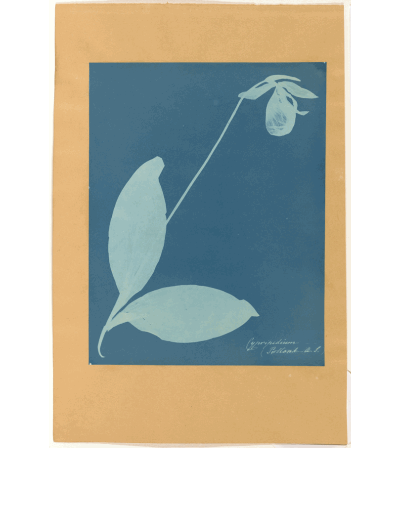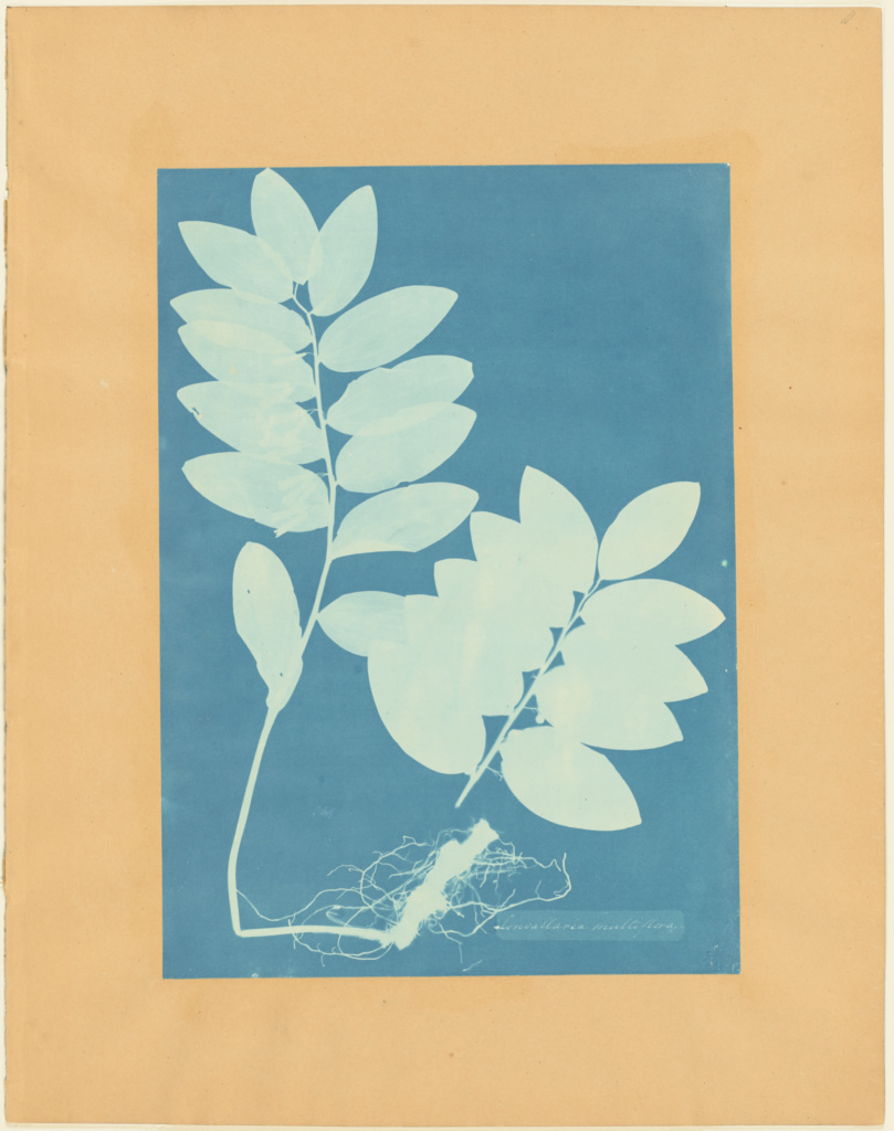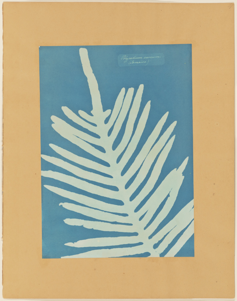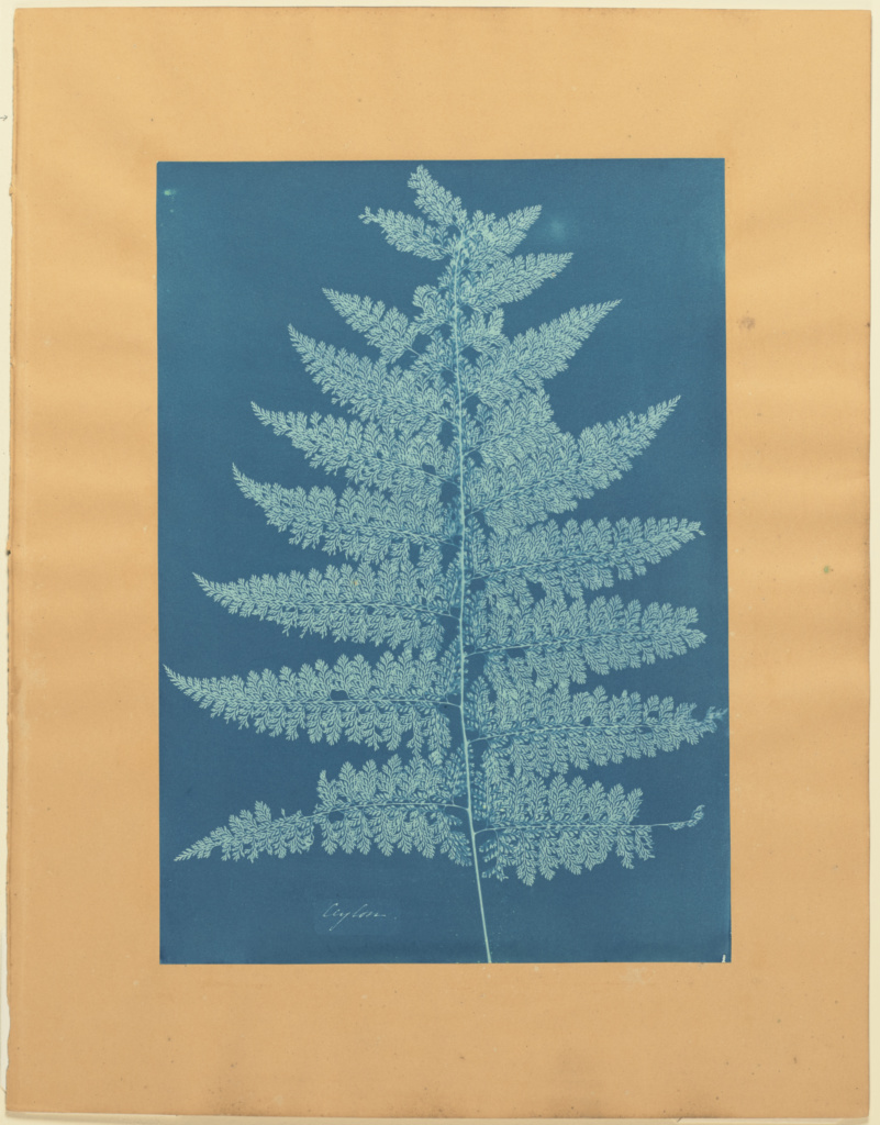 After completing the highly ambitious, decade-long project Photographs of Blue Algae: Cyanotype Impressions in the summer of 1853, Anna Atkins turned to new botanical subjects. She would eventually produce several unique presentation albums with cyanotypes of ferns and flowering plants. Atkins most likely collaborated on these albums with her dear friend, Anne Dixon. Dixon came to Halstead Place for an extended stay in the summer of 1852 to comfort Atkins who was deeply shaken by the death of her father and frequent scientific partner John George Children earlier that year. Photo historian Larry Schaaf suggests that it was during this stay or perhaps one the next summer that Dixon began assisting Atkins and creating her own cyanotypes. Thus, it becomes difficult to know whether surviving works from this time period were created by Atkins, Dixon, or both.1