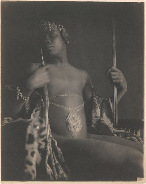 In the late 1890s Fred Holland Day (known as F. Holland Day) created a group of photographs featuring the Black artist and model J. Alexandre Skeete, who dressed in costumes, wore elaborate accessories, and held props that evoked Day’s image of African royalty. In this picture, Skeete poses as an Ethiopian chief, partially clothed in a draped robe and feather headdress. He holds a spear; a metal orb is located near his right hip; he casts his gaze downward, appearing self-possessed and strong.